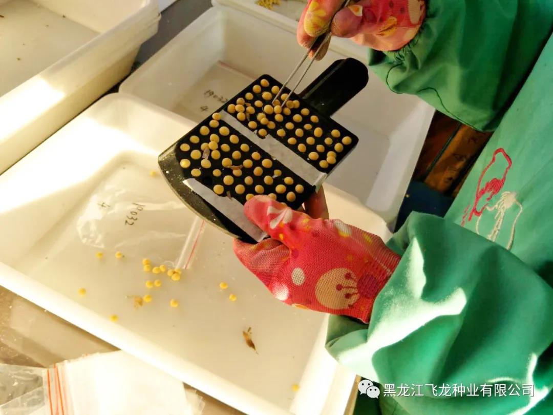 選種期間,科研人員需根據飛龍種業(yè)2020年的育種計劃,對大豆、玉米種子進行嚴格篩選。具有良好品質的種子,發(fā)芽率和發(fā)芽勢高,苗整齊茁壯。所以在選種時應將病粒、蟲蛀粒、小粒、秕粒和破瓣粒揀出。