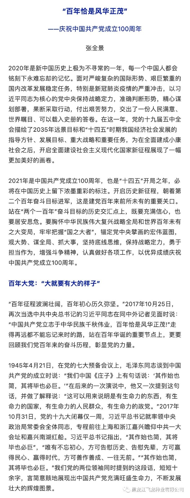 “百年恰是風華正茂”——慶祝中國共產黨成立100周年